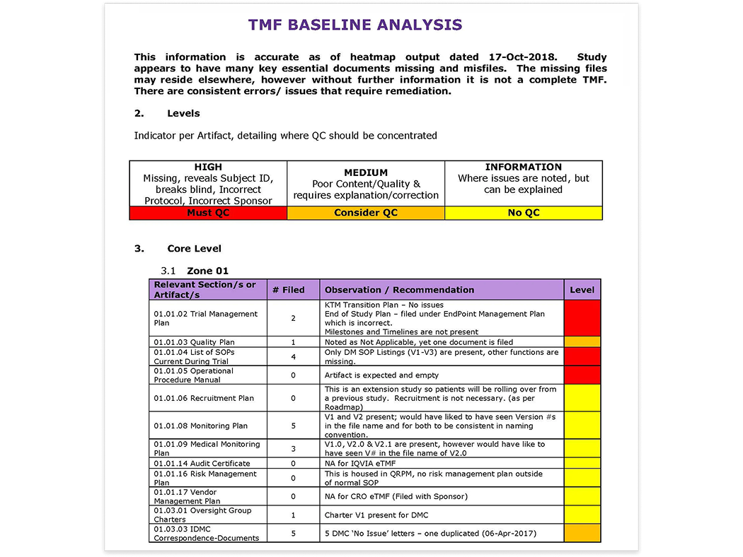 Nuestra revisión de calidad del TMF (a veces llamada «revisión del archivo») proporciona una evaluación línea por línea de su TMF, lo que le brinda una visión detallada de su calidad, integridad y puntualidad. Mucho más que una serie de informes de datos de TMF, la revisión comprobada por el cliente es realizada por nuestros profesionales expertos en TMF con un profundo conocimiento de los estándares de inspección actuales en cada una de las principales agencias reguladoras.
