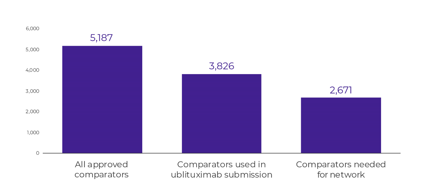 In het hier besproken voorbeeld zou vroege netwerkkartering hebben aangetoond dat vergelijkingspunten naast ocrelizumab en ofatumumab in de SLR moesten worden opgenomen; het zou ook hebben aangetoond dat alemtuzumab en natalizumab niet nodig waren, waardoor het aantal te screenen samenvattingen verder werd verminderd (figuur 4).